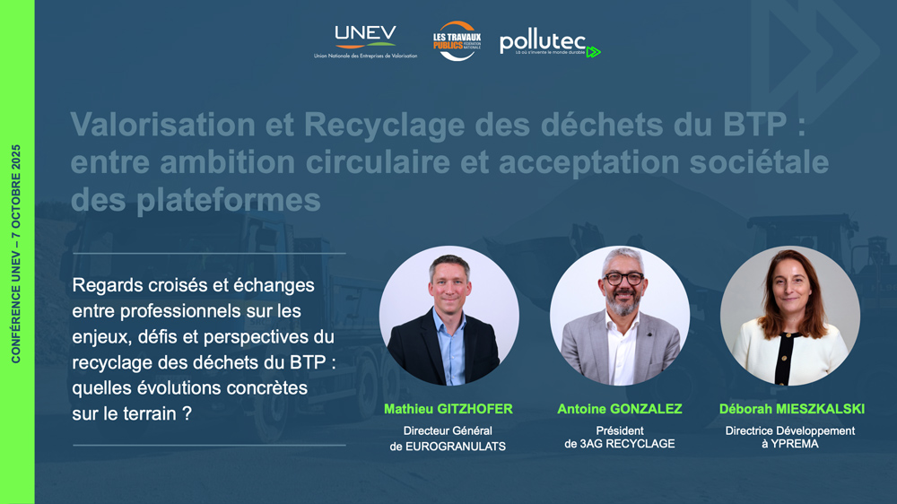 UNEV à Pollutec du 7 au 10 octobre 2025 L’UNEV interviendra lors d’une table ronde organisée le 7 octobre 2025 à 11h45 intitulée Valorisation et Recyclage des déchets du BTP : entre ambition circulaire et acceptation sociétale des plateformes. Cette rencontre est l’occasion d’échanger sur les enjeux, les défis et les perspectives liés au recyclage des déchets du BTP, et de mettre en… Poursuivre la lecture UNEV à Pollutec du 7 au 10 octobre 2025